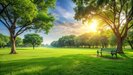 Serene Sunset Park Scene A solitary bench sits beneath the shade of lush trees on a vibrant green lawn, bathed in the golden light of a picturesque sunset.