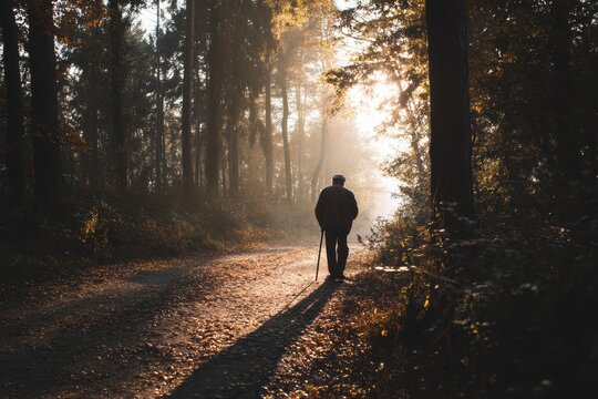 solitary nordic walker traverses misty forest trail in soft morning light utilizing poles to enhance rhythmic flow