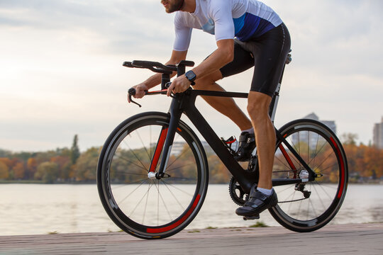 Close-up of cyclist pedaling on sunlit road with motion blur