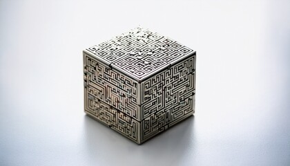 intricately solved puzzle cube isolated on a pristine white background