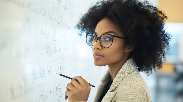 Young Black Female Genius Solves Complex Mathematical Problems and Writing Long Equations on the Whiteboard. Higher Education, Science, Technology and Innovation Concept.