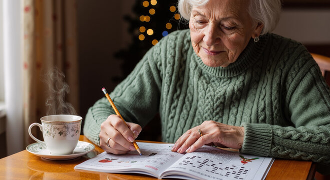 elderly woman in cozy sweater solving crossword puzzle next to steaming cup in warm living room