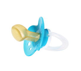 Blue and yellow pacifier on white background