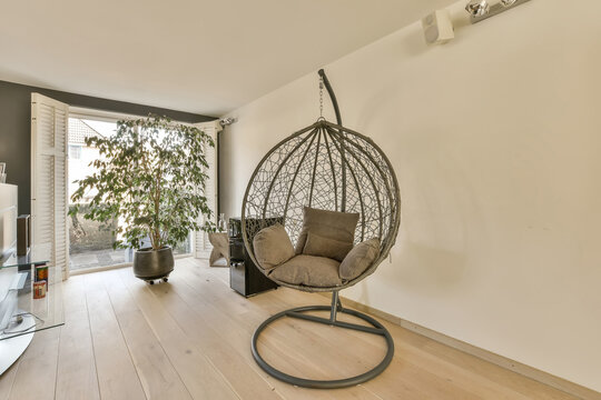 Modern white sofa with pillows under hanging greenery