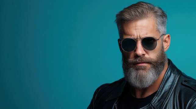 A striking image of a mature man with a majestic beard and stylish sunglasses, exuding confidence and sophistication against a brilliant blue backdrop, showcasing timeless style.