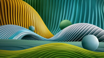 Abstract modern illustration. Green waves soundwaves or sine waves, loating orbs, optical illusions. Digital art for poster, template, flyer, banner background or design element.