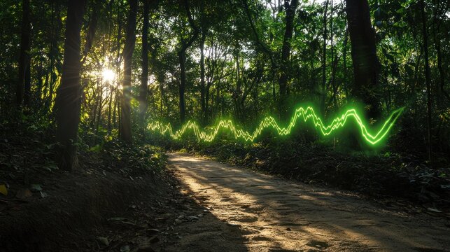 A serene forest path illuminated by sunlight, with a visual sound wave overlay.
