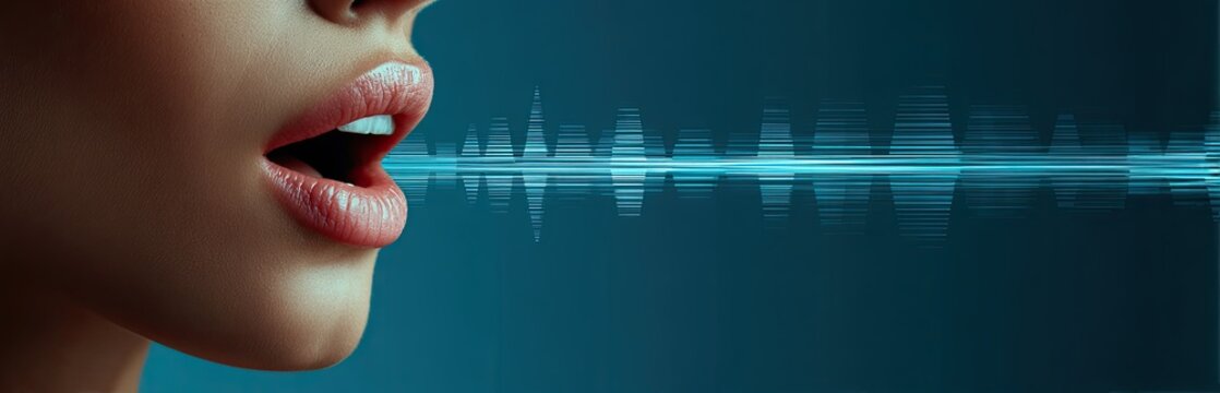 A side profile of a woman's face, with open mouth, and soundwaves on a dark blue background