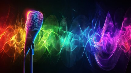 A close-up view of a vintage, chrome-plated microphone with soundwaves emerging from it, set against a colorful backdrop