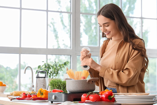Photo of pretty caucasian woman holding cooking ladle spoon while eating soup at home