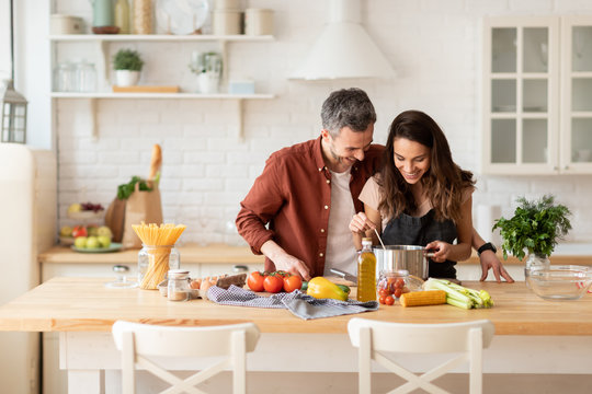 Young woman standing near stove and cooking, housewife, meal, chef, food.Happy woman looking and smelling tasting fresh delicious from soup in a pot with steam at white interior kitchen