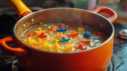 A colorful and vibrant soup that features playful toy boats swimming in an orange pot