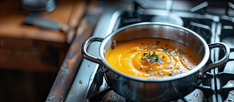 Homemade Hokkaido vegetable soup or red kuri squash pureed in a steel pot on a stove, with a fall cooking vibe, featuring copy space image, focused view.