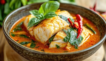Authentic Thai Menu: Spicy Red Curry Pangasius Fish Soup With Fresh Herbs, Basil Leaf, And Carved Chili Garnish Along The Side