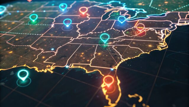 A brightly colored digital map of the Southeastern United States, highlighting various locations with glowing markers.