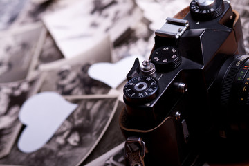 Old camera on a wooden background. Old aged soviet film camera close-up front view. Vintage camera on wooden background near antique books still-life photography