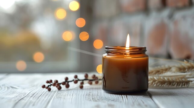 Burning soy candle in brown jar on white wood surface for winter home decor