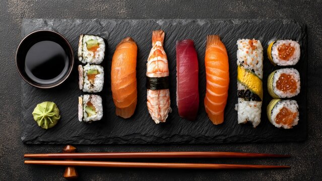 Assorted Sushi and Sashimi Displayed on Black Slate with Chopsticks