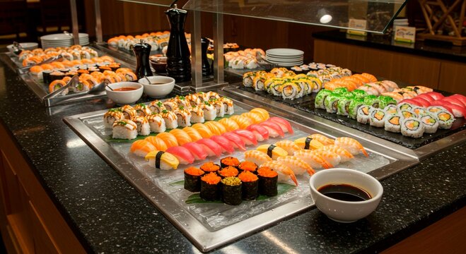 A buffet display of sushi rolls and nigiri with soy sauce and serving tongs