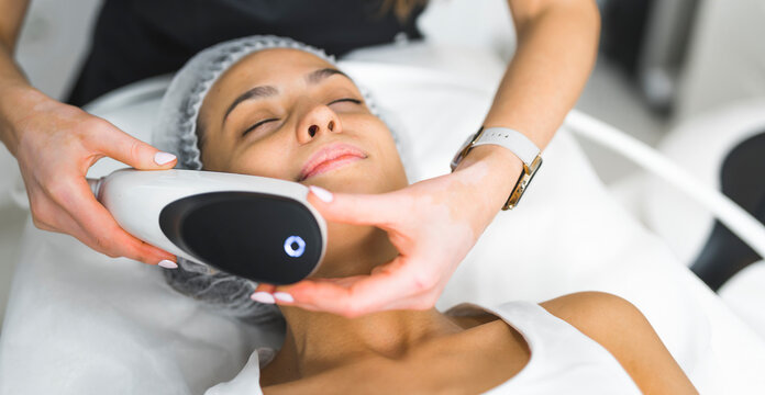 Professional spa facials concept. Erbium-yag fractional laser creating micro thermal zones in the skin of beautiful relaxed young Latin girl. High quality photo