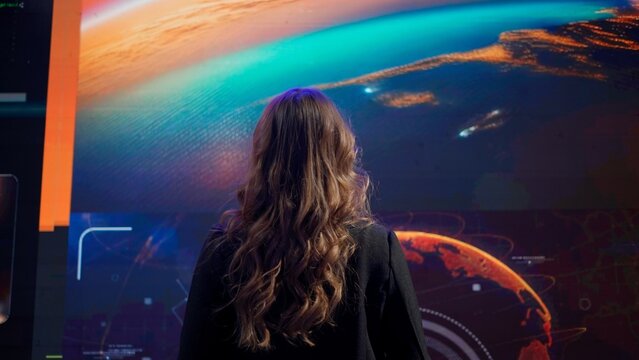 Earth control center, team monitoring galaxy on big screen. Group of people in mission center working on computers, observing discussing flight and space data.
