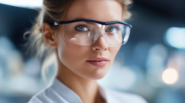 Faceless portrait of female scientist in protective eyewear, research professional with safety equipment, laboratory safety protocols, defocused face, with copy space