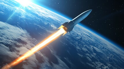 Spaceship launch from Earth in sky. Mission to Moon. Return to Moon. SLS space rocket. Orion spacecraft. Artemis space program to research solar system. Elements of this image furnished by NASA