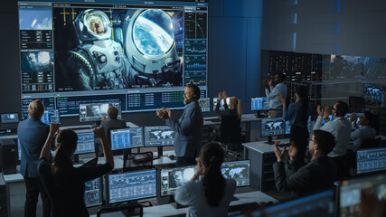 Group of People in Mission Control Center Establish Successful Video Connection on a Big Screen with an Astronaut on Board of a Space Station. Flight Control Scientists Stand Up and Clap Hands.