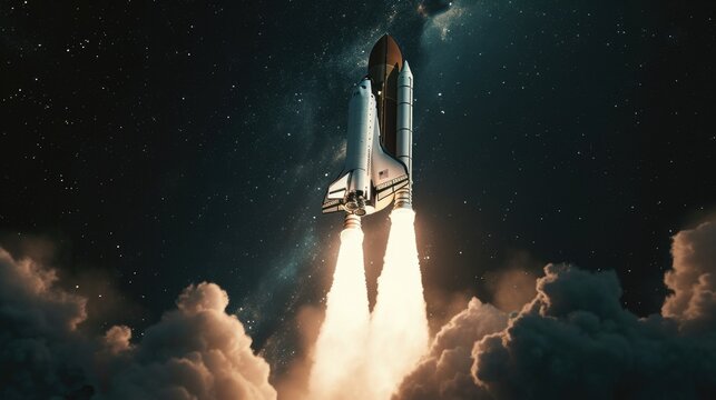 A space shuttle taking off into the sky. Suitable for technology, space exploration, and futuristic concepts
