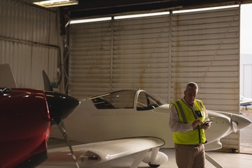 Engineer examining plane while using digital tablet