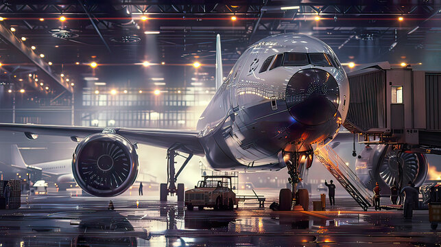 Hyper-realistic image of a passenger aircraft undergoing engine and fuselage repair in an airport hangar detailed view of the maintenance process