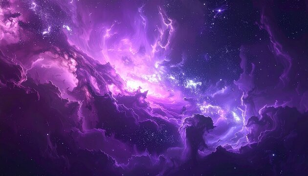 Vibrant cosmic nebula with bright purple, blue, and pink hues swirling against a dark star-filled space backdrop evoking a sense of wonder and vastness