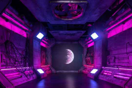 The interior of a spaceship with a large porthole and a view of the planet. There is an open space outside the window. There are power cables and neon lights sticking out of the ship hull.