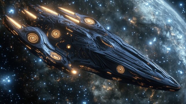 generation ship traveling between stars, reflecting cosmic dust and nebula lights on its steel hull