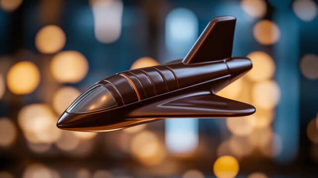 Side view of a futuristic chocolate spaceship sculpture sleek and aerodynamic with metallic looking chocolate elements floating in a galaxy themed background