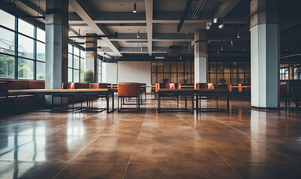 An expansive industrial space features polished concrete flooring and large, bright windows. The clean lines and open layout create a versatile environment suitable for various events