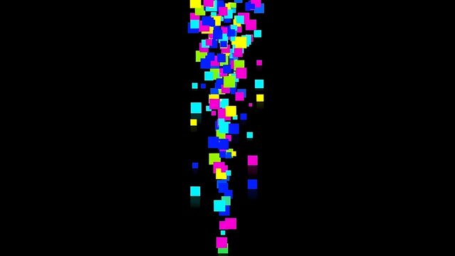 Smiling woman in light top celebrating in studio by tall windows, falling gold confetti, copy space