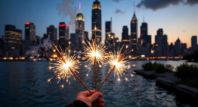 A hand with sparkler candles on the background of an evening metropolis by the water, city lights and a festive atmosphere