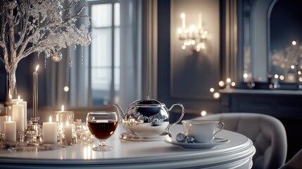 A white table adorned with candles, a teapot of black tea, and festive decorations captures the cozy New Year's spirit at night
