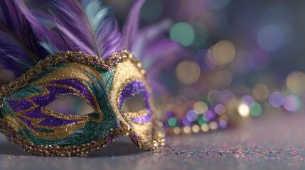 Colorful mask on a table with sparkling decorations during a festive celebration at night