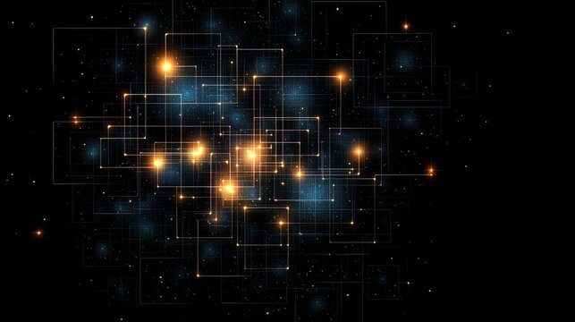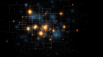 Black and orange background with many small squares and lines. The squares and lines are lit up with bright colors