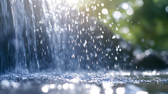 A close-up of water droplets sparkling in the sunlight as they fall from a waterfall, creating a refreshing mist in the summer air