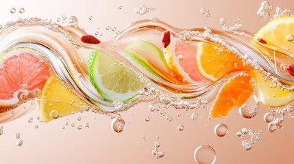 Dynamic abstract wave of citrus fruits including lime, lemon, orange, and grapefruit inside a stream of sparkling liquid. A vibrant concept of freshness, vitamin boost, and creative fluid motion
