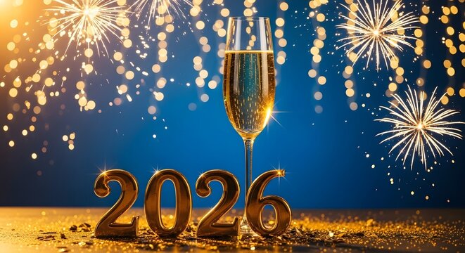 Golden 2026 numbers illuminated by sparkling fireworks and a champagne flute filled with bubbly liquid on a reflective surface