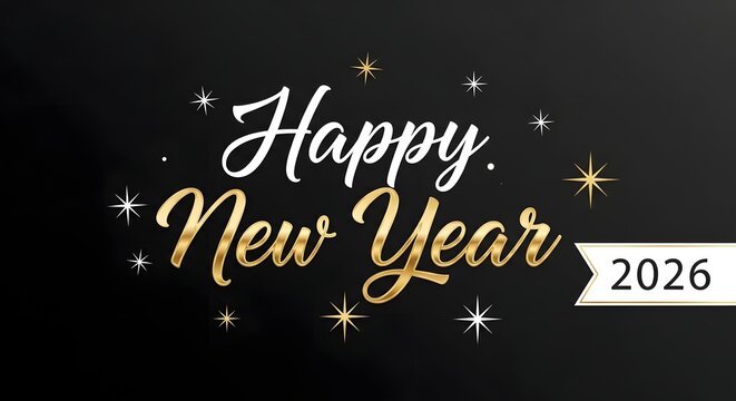 Elegant happy new year 2026 greeting with sparkling golden and white script text and festive starbursts on a dark black background