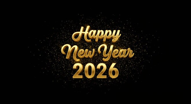 Happy new year 2026 text with sparkling glitter and confetti isolated on white background