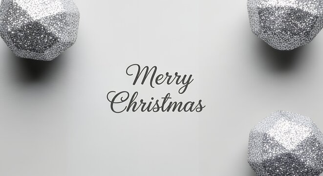 Four sparkling silver Christmas baubles are arranged on a light grey background with elegant script text reading Merry Christmas in the center holiday