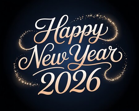 Elegant golden script text happy new year 2026 with sparkling trails and bokeh lights
