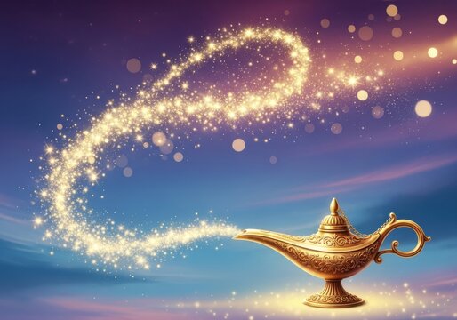 A golden magic lamp with a trail of sparkling light against a dreamy blue and purple sky, evoking wishes and fantasy concepts
