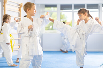Children in kimono practicing karate in a sports gym. Martial arts training session
